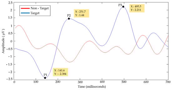 The average Target signal shows a negative component (P1) with a minimum value of −2.384 μV at 141.6 ms and two positive components (P2 and P3) with maximum values of 1.44 and 2.211 μV at 251.7 and 495.5 ms, respectively. The EEG signals shown were filtered into a frequency band of 1-8 Hz. Table 1 shows the average of the peak values of the components P1, P2 and P3 obtained at different times of occurrence. The Target signals (epochs of 700 ms) that did not clearly present these components were discarded in the average.