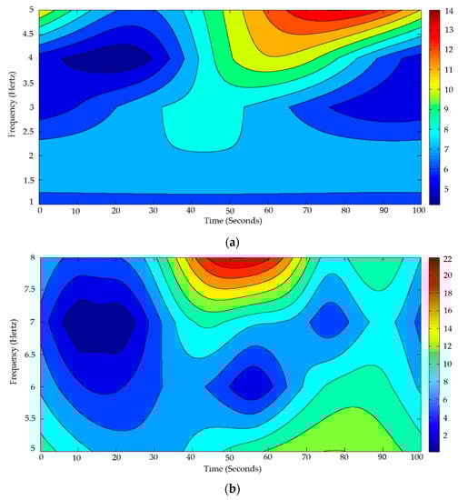 Stockwell transform spectrograms of the EEG signal of Subject 3: (a) frequency range of 1–5 Hz; and (b) frequency range of 5–8 Hz.