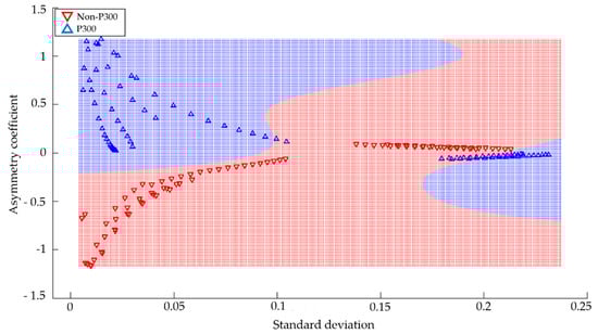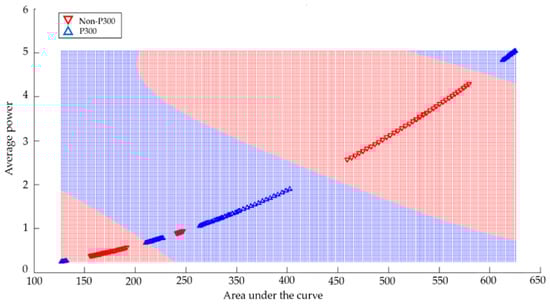 In this particular case, 92% accuracy of identification was obtained. The SVM algorithm divided the space into two groups by means of the training feature vectors. The blue area represents the P300 group and the red area represents the non-P300 group. Moreover, triangles of blue and red are displayed, which represent the test feature vectors of the groups P300 and non-P300, respectively. Figure 8 shows the results of the classification obtained from Subject 2 in the frequency range of 5–8 Hz, using the functions of average power and area under the curve with the SVM algorithm.