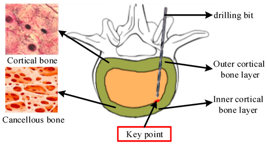 As shown in Figure 1, when drilling a path in a pedicle, the drilling bit drills the targeted bone from outer cortical bone layer, goes through middle of cancellous bone and then stops in front of the inner cortical bone. In this way, any weakening of the mechanical properties of the spine can be minimized. Therefore, it is particularly important to detect the key point and for the drilling bit to then stop in front of the inner cortical bone. The research described in this paper aims to extract the features of AE signals during the process and realize the identification of the key point after subsequent processing.