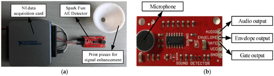 (a) The AE signal acquisition system, where (b) is the AE detector used for AE signal collection, the NI data acquisition card is used to send the data to computer and the printed piece is used for signal enhancement.