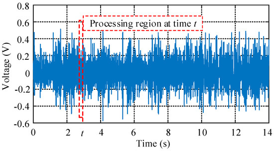 The AE signal during bone drilling in time domain, part of the signal in the dashed frame is used for subsequent signal processing of time t.