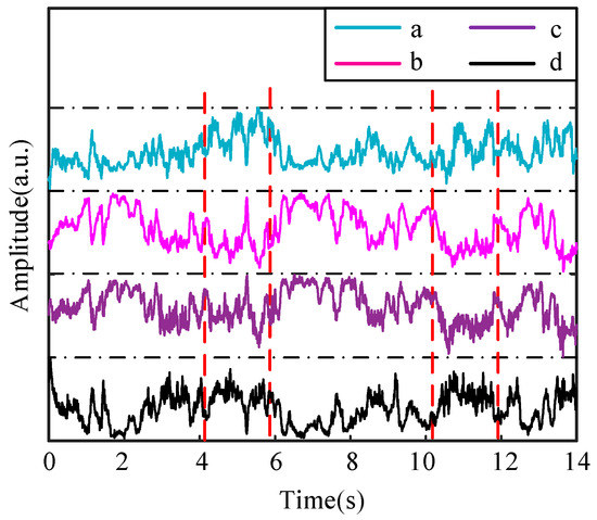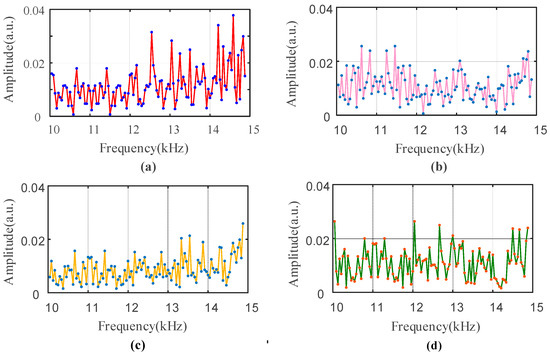The distribution of the frequency between 10 kHz and 15 kHz after using the recursive FFT for different moments, where (a) corresponds to the moments of drilling the cortical bone; (b) is related to the cancellous bone; (c) is the transition region from cortical bone to cancellous bone and (d) is the transition region from cancellous bone to the inner cortical bone. In addition, the y-label is energy intensity distribution at various frequency values.