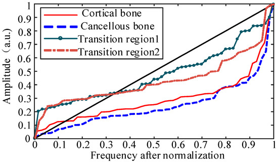 When the energy distribution in the process of drilling bone is concentrated in some certain frequency bands, after normalization and sorting processing, the curve deviates from the “original line”. However, the function curve can’t distinguish the signals of high-frequency energy bands from low-frequency energy bands. The reason is that when the energy is concentrated in low-frequency bands, after processing, the role of the low-frequency energy segment is more significant and will be concentrated in the latter part of the curve, which is the same as the situation when the energy is mainly distributed in high frequency bands. Just as the Figure 5 shows, it’s hard to distinguish the red solid line which represents the cortical bone from the blue dotted line that represents the cancellous bone.