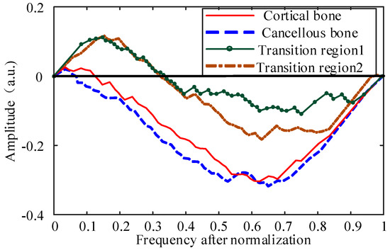 By comparing the distribution for amplitudes in Figure 4a–d, it can been seen that the amplitude distribution for cortical bone layer is concentrated in high frequency bands while the distribution for cancellous bone layer is concentrated in lower frequency bands. However, compared with the former graphs, the amplitude distribution of the transition region is relatively uniform for the reason that the local maxima are smaller than the values in the former graphs and the distributions have little differences during the changes of values. In another words, the distribution can also be considered as be concentrated in intermediate frequencies for the transition region. This conclusion can be further analyzed and some certain characteristics can be found to describe the regularities.