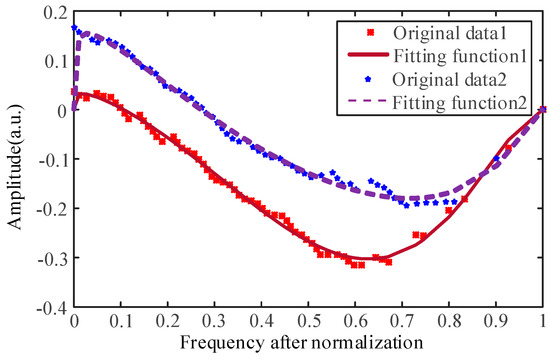 As can be seen in Figure 7, the curve is distributed on both sides of x-axis and appears to be in the shape of a sine curve. Therefore, the fitting function should include a sine term that is across the points (0, 0) and (1, 0) and try to keep the function in a sine cycle. In addition, the change of coefficient of the sine function should also be able to control the intersection of curve and x-axis, so the sine function can be expressed in the form: