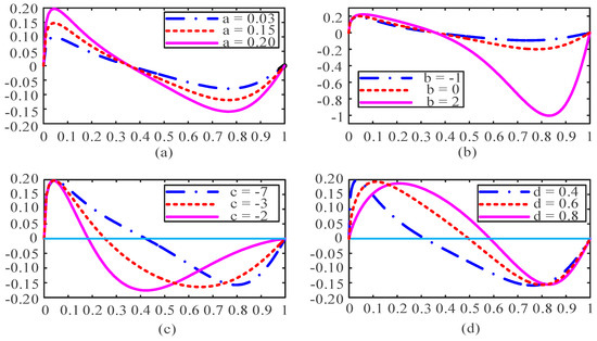 Changes in shape of the curve under the influence of coefficients, where (a) shows different curves when the coefficient a changes in [0.03, 0.20]; (b) is for the coefficient b in [−1, 2]; (c) is for the coefficient c from −7 to −2 and (d) is for the coefficient d from 0.4 to 0.8.