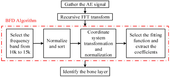 To sum up, the whole process can be summarized in several simple steps. Firstly, we collect the AE signals and use the recursive FFT method to transfer the signals into the frequency domain for analysis. Then, we use the proposed FDB algorithm to deal with and get the sets of coefficients as results. Lastly, the bone layer identification can be realized by the coefficients. The whole process can be seen in Figure 10.