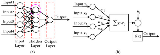 In Figure 11b, x1–x4 are input values of the eigenvectors, wij is the weight corresponding to input xi and bj is the corresponding threshold or offset value. The weight and threshold value will continuously change according to the error feedback in the network training process to let the network achieve the best conditions. The fitting function coefficients are used as eigenvectors. In order to facilitate the processing and comparison of data, the eigenvectors need to be normalized to make the Euclidean norm equal to one. For the coefficients a, b, c, d, we use the maximum-minimum normalization (9) to process the signals: