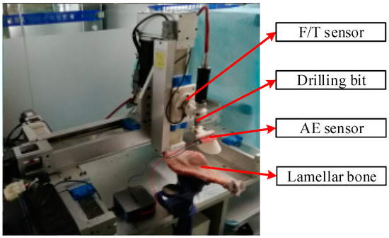 In order to prove the validity of the proposed algorithm and realize the identification of key points, several experiments on different bone samples were carried out. An existing three-axis Cartesian robot is used and the drilling bit is mounted at the end of the robot for drilling operations. A 6-DOF force/moment sensor is also mounted to measure and record thrust force during drilling operations. In addition, AE signals are captured by an AE detector sensor and the collected data is transmitted to a PC through a data acquisition card, just as shown in Figure 12. The maximum sampling rate of the acquisition card is 50 kS/s, which can fully meet the conditions of AE signal acquisition. The lamella used in the experiments are different fresh bones captured from different samples, which have the same bone structure and similar physical and mechanical properties like human bones. The typical structures of bones have cortical and cancellous bone layer, and the trabecular bone, which is an extension of cortical bone in cancellous bone, can be considered as the transition region. In all experiments, a twist drill with a diameter of 2.5 mm is chosen. The speed of the drill bit is 20,000 rpm and the feed rate of the robot end is 1 mm/s.