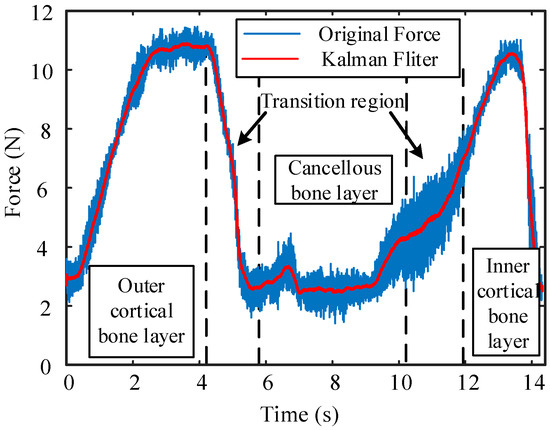 Force signal for bone layer identification. The blue line represents the original data and the red line is the signal after processing by the Kalman filter, which is smoother. Different bone layers for different times are listed in the figure.