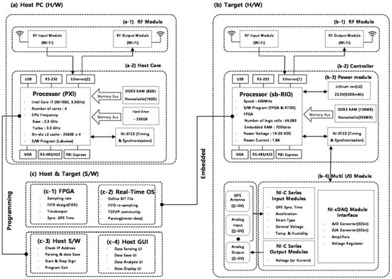 To enable two-way wireless communication between the host PC and the target, lastly, a RF module was adopted as shown in Figure 1(a–1,b–1). The RF ipTIME-A2004NS-R module is sensitive enough to receive data up to 867 Mbps at maximum, based on WiFi. In it, the two-way wireless communication can be selectively chosen at WiFi 2.4 GHz or 5 GHz RF band. In this study, a ipTIME-A2004NS-R was adopted so as to make it possible to select freely RF bands in accordance with the site conditions of structures (e.g., target installation location, communication obstacle, etc.). Then, a two-way RF module was designed to get structural responses effectively and output the host commands (e.g., realtime feedback control) if necessary. The hardware (host PC and target) developed from the selection of the said diverse modules and organic hardware configuration are shown in Figure 2 below: