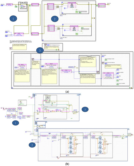 First, the FPGA program in Figure 3a was developed under the following three main logics: (1) It is designed to decide on the sampling rate of each measurement module (e.g., NI-9467, 9234, 9237) by second and then initiate them. (2) A FIFO (first-in first out) was constructed to get only a single piece of information at a time by each channel by means of the analogue voltage input at each different sampling rate by second in accordance with each module through the repetitive statement (FOR loop). (3) To create GPS values in real-time in the FPGA, the FPGA TIMEKEEPER was used after being programmed to synchronize the signals collected by each module in accordance with the created GPS time interval (1 pps).