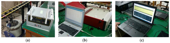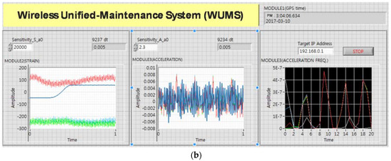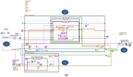 In addition, the software of the host PC (Figure 1(c–3,c–4)) was developed into the two—the operating program (Figure 4a) and GUI (Figure 4b)—to receive, save, analyze and display the response signals received from the target. The operating program in Figure 4a was developed under the following four main logics: (1) After checking the IP address of the target to collect data, the data storage position was decided. (2) Data were collected after classifying the data from the target using metadata. (3) In order to end communication, an event case was parallelized (true or false) to create a stop command. (4) After data collection, an error is forced to occur for an end of communication, eventually for a termination of program. Lastly, the GUI program in Figure 4b was developed to display the results (e.g., measured data by module or channel, analysis results) of the logics developed by the host based on the operating program in Figure 3a.