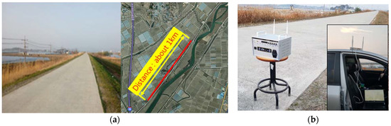 For the test of communication distance, a riverside open field in Nonsan city (Nonsan-si, Chungnam, South Korea) was chosen because it had over 1 km straight roadlinear distance with low signal interference. In addition, no obstacles were found. Figure 5a reveals the view of the open field with its satellite photo, and Figure 5b shows the WUMS installed on the open field for the test of communication distance. Each of the tests at WiFi 2.4 GHz was carried out first at the point of 100 m away from the WUMS and then at every 100 m further up to 1 km, and the same tests were carried out at WiFi 5 GHz. All tests were aimed to find how far the WUMS would be sensitive enough to receive communication signals. Its sensitivity is tabled in Table 1 and Table 2 below.