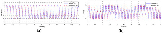 In the test, static and dynamic responses were obtained from the modal shaker (5 Hz, sine wave) through wired and wireless communications. The wired and wireless responses from the response test were shown in Figure 7. Figure 7a shows displacement responses obtained through wired and wireless communications while Figure 7b states acceleration responses acquired through wired and wireless communications. As shown in Figure 7, both results are found to be nearly the same, whether wired or wireless. It is thus found that the WUMS developed in this study is good enough to be a data logger without being wired, and successfully measure multiple responses through wireless communication simultaneously.