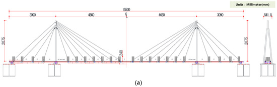 To check the structural response performance of the WUMS and examine its practicality, a modal test was performed, using a model bridge. For a model bridge, a Korean flagship cable-stayed bridge called ‘Dolsandaegyo Bridge’ was reduced in size to 1/30 scale and designed as shown in Figure 8a and actually built as illustrated in Figure 8b.