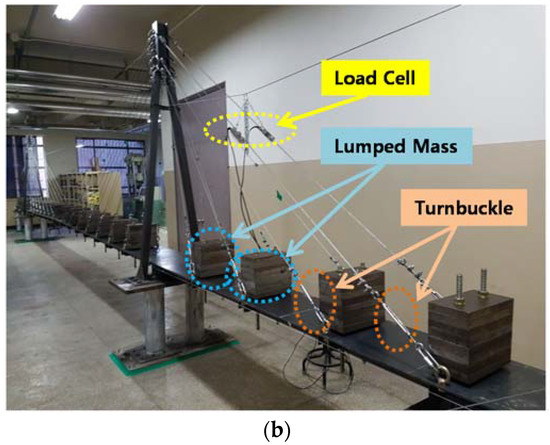 As a model bridge, we built a cable-stayed bridge whose total length is 15,500 mm, with a middle span of 9320 mm and a side span of 3090 mm. Its tower was as high as 2075 mm while its width 400 mm. Forty-four cables in total were used to sustain the load of superstructure. In addition, a lumped mass of 80 kg was applied to 23 spots (22 cable spots, 1 middle spot in the middle span) to have the model bridge experience relatively low natural frequency. All bridge structures but cables were designed with common steel. For cables, stainless steel wires (7 × 19 strand) of 4 mm and 6 mm in diameter were adopted. To impose the constraint conditions on the model bridge, a tower hinge was used on the left, and rollers were adopted on both right and left sides. Lastly, each cable was tied symmetrically from the inside to the outside based on the main tower in accordance with the tension introduction of the actual bridge. To facilitate a smooth introduction of tension, this study adopted a turnbuckle whose loosening and tightening of the turnbuckle were to generate tension, which was confirmed by means of a tension-measuring load cell (Model WLFN2 Series) specifically used for a 500 kg rope.