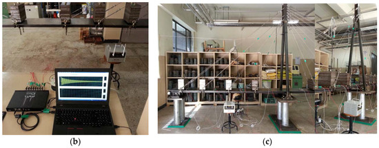 Response test using a modal shaker: (a) Wireless responses (displacement and acceleration) test; (b) wired response (displacement) test; (c) wired response (acceleration) test.