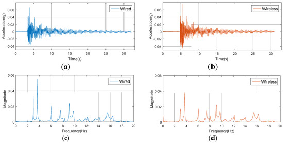 Results of modal test: (a) Wired time domain; (b) wireless time domain; (c) wired frequency domain; (d) wireless frequency domain.