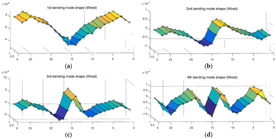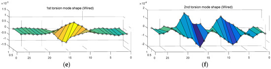 Wired mode shape: (a) 1st bending mode; (b) 2nd bending mode; (c) 3rd bending mode; (d) 4th bending mode; (e) 1st torsion mode; (f) 2nd torsion mode.