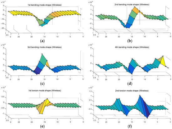 Wireless mode shape: (a) 1st bending mode; (b) 2nd bending mode; (c) 3rd bending mode; (d) 4th bending mode; (e) 1st torsion mode; (f) 2nd torsion mode.