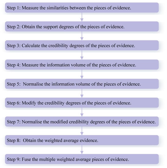 The proposed method is composed of the following procedures. The credibility degree of the pieces of evidence is first determined on the basis of the similarity measure among the BPAs. Then, the credibility degree is modified by leveraging the belief entropy function to measure the information volume of the evidence. Afterwards, the final weight of each piece of evidence is obtained and adopted to adjust the body of evidence before using Dempster’s combination rule. The specific calculation processes are listed as follows. The flowchart of the proposed method is shown in Figure 1.