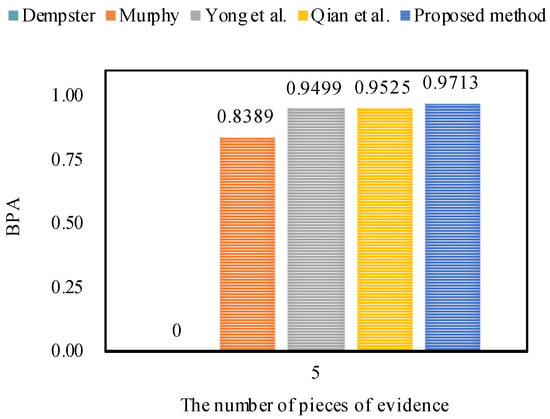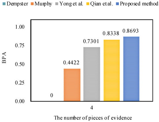 Obviously, Qian et al.’s combination method [59] and the proposed method show reasonable results and classify the species of flower as the target with 83.38% and 86.93% belief values, respectively. Therefore, we can conclude that the proposed method is more efficient than other related methods with better accuracy of data classification, as shown in Figure 4. The reason is that the proposed method not only takes the interplay between the pieces of evidence into account, but also considers the impacts of the pieces of evidence themselves.