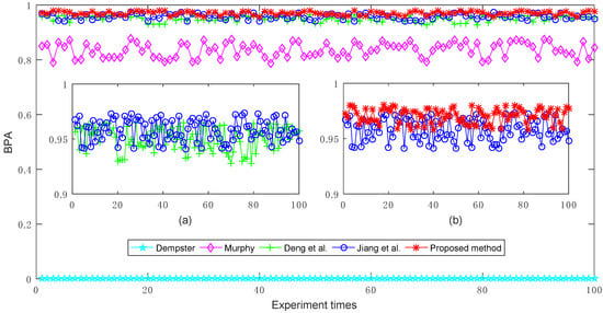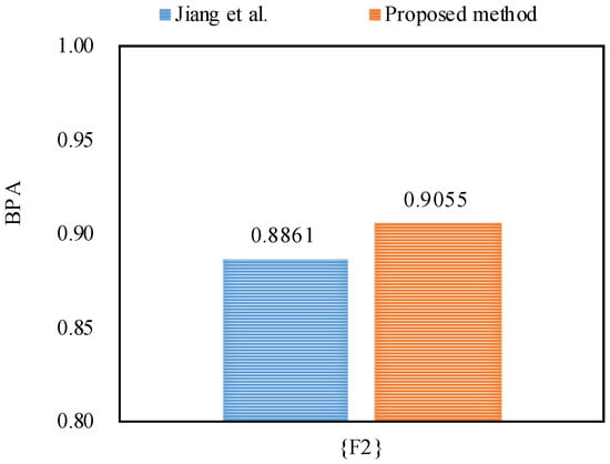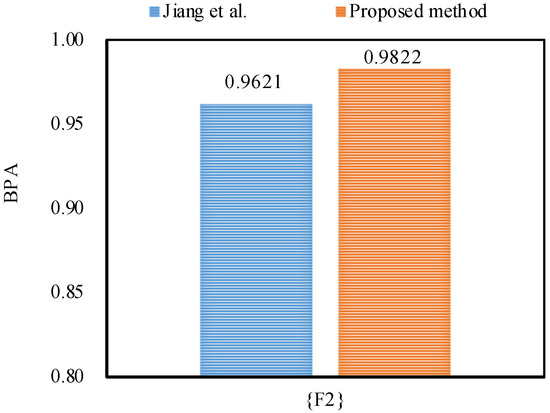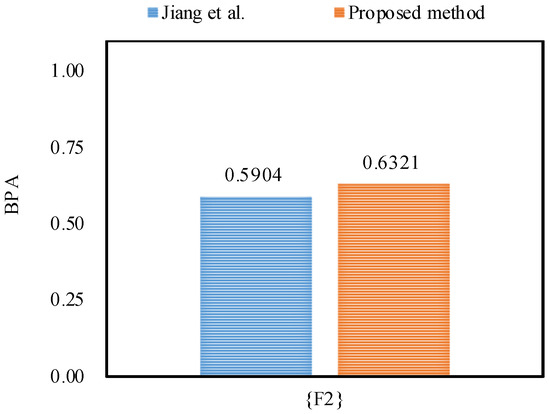Furthermore, the proposed method outperforms Jiang et al.’s method [48] in dealing with the uncertainty as shown in Figure 5, Figure 6 and Figure 7, because by utilizing the proposed method, the belief degrees allocated to the target fault type at frequency, frequency and frequency increase up to 90.55%, 98.22%, and 63.21%, respectively; however, by using Jiang et al.’s method [48], the belief degrees allocated to the target at frequency, frequency and frequency are 88.61%, 96.21%, and 59.04%, respectively.