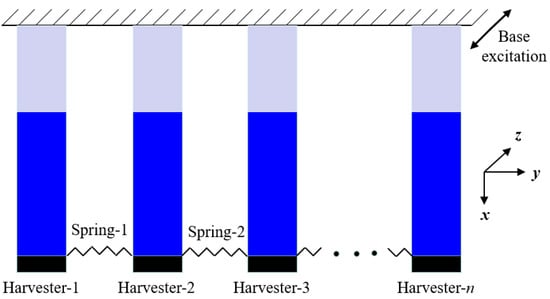 The idea of the presented NPEHS is based on the linear element coupled system, as its schematic diagram shown in Figure 1. The equivalent model of each linear energy harvester is surrounded by the closed blue dotted line, which was explored in Ref. [3]. Although each independent energy harvester has linear characteristics, based on coupled dynamic behaviors [65,66,67], the whole system will exhibit nonlinear characteristics when two adjacent linear energy harvesters are connected by linear springs (K1, … Kn−1 stand for their stiffness). Figure 2 shows the structure diagram of the presented NPEHS. In principle, the NPEHS contains n linear piezoelectric energy harvesters with different resonant frequencies, and they are connected by n − 1 linear springs. The base excitation is imposed in the z direction, which is the same direction of the bending vibration of each energy harvester of the NPEHS. All the linear springs are connected in the y direction (width direction of each energy harvester). The NPEHS will exhibit nonlinear dynamic response characteristics when it is subjected to an excitation, because the nonlinear spring force is inevitably produced by the linear springs (which are disproportionately extended by the different vibration displacements from two connected adjacent energy harvesters in the system). The bending stiffness for a cantilever beam with rectangular cross section is . Therefore, the ratio of the bending stiffness for the lateral motion (y direction) EIy and the bending stiffness for the transverse motion (z direction) EIz is . In this paper, the width b of the substrate is 65 times more than of the thickness h, which will be given in Table 1 in Section 3. Therefore, EIy is more than 4000 times of EIz. In this case, the lateral motion is negligible. It is truly that the harvester will become softer in the y direction as the stiffness of the connected spring increases. However, the stiffness of the connected spring is much smaller than the lateral equivalent stiffness in this study.