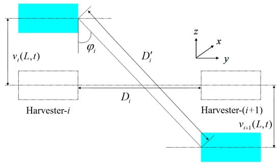 Relative geometrical position of two adjacent harvesters.