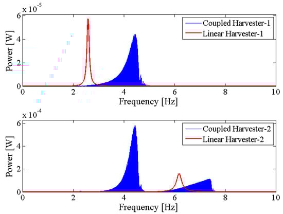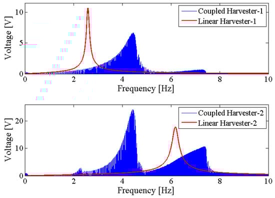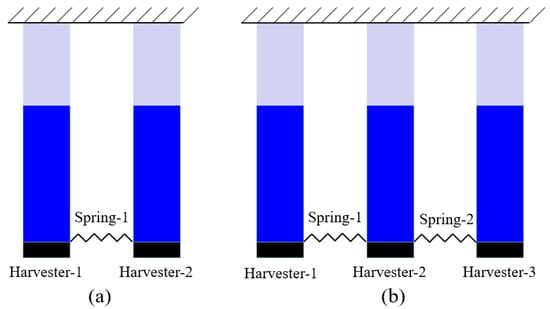 In the last section, the theoretical model of the NPEHS is derived. In order to verify its energy harvesting enhancement, the NPEHS-1 (n = 2) and the NPEHS-2 (n = 3) are investigated below, and their diagrams are shown in Figure 5a,b, respectively. The geometrical parameters of each harvester are shown in Table 1. The material property parameters are depicted in Table 2. In detail, beryllium bronze (UNS C1720) is selected as the substrate, whose density and Young’s modulus are 8250 kg/m3 and 125 GPa, respectively. Piezoelectric laminate properties are referred to [45]. The tip mass of each harvester is made of the same material with the substrate, and its size is 15 × 10 × 5 mm3. The natural frequency of harvester-1, harvester-2 and harvester-3 is calculated to be 2.59 Hz, 6.18 Hz and 8.86 Hz, respectively. In this section, 0.2 g is selected as the harmonic base excitation level. In addition, linearly increasing frequency excitation simulations with a low rate of frequency change (0.03 Hz/s) are performed.
