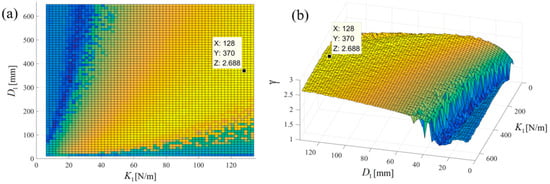Figure 6 shows the output power area ratio of the NPEHS-1 along with different (ranging from 6 mm to 134 mm) and (ranging from 10 N/m to 650 N/m). In detail, Figure 6a,b are the top view and the oblique view of the output power area ratio along with different and of the NPEHS-1. The brighter the area stand for the higher . It is found that the optimal initial length and the optimal stiffness of the connected spring-1 in the NPEHS-1 are 128 mm and 370 N/m, respectively. In this case, is 2.688, which means that the output power area of the NPEHS-1 is 268.8% of that of its linear counterparts. The ratio of the physical stiffness of the harvester-i and the stiffness of connected spring can be approximate to , and and are 0.086 and 0.70, respectively. As the output voltage shown in Figure 7, the NPEHS-1 with optimal spring-1 can efficiently harvest vibration energy over a wider range of excitation frequencies. In addition, the response voltage curve of coupled harvesters in the NPEHS-1 shows obvious nonlinear dynamic response characteristics, which can be identified by comparing with the response voltage curve of linear harvesters in the same plots. The energy harvesting enhancement of the NPEHS-1 can be found in the output power curves, as shown in Figure 8.