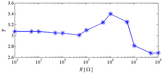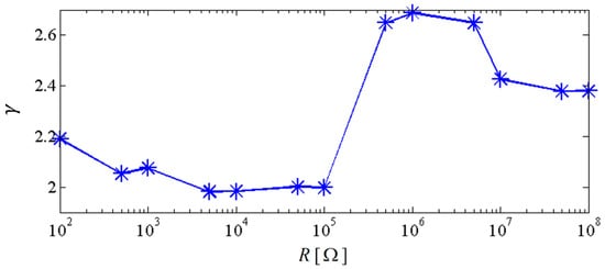If the excitation frequency range where the output power is larger than 20 μW is considered to be effective, the effective bandwidth of the coupled harvester-1 is 0.45 Hz which is 321% of that (0.14 Hz) of the linear harvester-1, as shown in the first plot of Figure 8. Meanwhile, the bandwidth of the coupled harvester-2 is 4.86 Hz, while the bandwidth shrinks to be 0.86 Hz in its linear case, as shown in the second plot of Figure 8. This demonstrates that the bandwidth of the NPEHS-1 is wider than its linear counterparts. Figure 9 shows the different output power area ratio of the NPEHS-1 subject to different load resistance R (ranging from 100 Ω to 108 Ω), and each is larger than 1.9. These results further verify the improvement of the energy harvesting performance of the NPEHS-1.