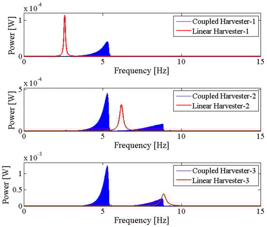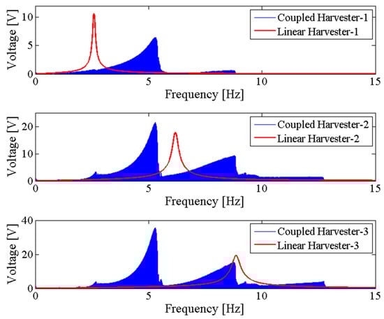 In order to further examine the energy harvesting enhancement of the proposed system, the NPEHS-2 which consists of harvester-1, harvester-2, harvester-3, spring-1 and spring-2 is studied. Based on calculation, 320 N/m and 78 mm are the optimal stiffness and the optimal initial length of spring-1, respectively. 180 N/m and 8 mm are the optimal stiffness and the optimal initial length of spring-2, respectively. The ratio of the physical stiffness of the harvester-3 and the stiffness of spring-2 is about 3.371. The comparison of the NPEHS-2 and its linear counterparts is shown in Figure 10 and Figure 11. The NPEHS-2 exhibits nonlinear dynamic response characteristics, since the voltage response curves in Figure 10 have obvious frequency-jump phenomena [35,36,37,38,39]. Such nonlinear characteristics can efficiently improve the vibration energy harvesting capacity. In this case, the output power area ratio is 3.398, which is larger than that of the NPEHS-1. If the excitation frequency range where the output power is larger than 20 μW is considered to be effective, the effective bandwidth of the coupled harvester-1, the coupled harvester-2, and the coupled harvester-3 of the NPEHS-1 is 0.52 Hz, 3.30 Hz and 3.51 Hz, respectively, as the output power shown in Figure 11. However, the effective bandwidth of the linear harvester-1, the linear harvester-2 and the linear harvester-3 is only 0.14 Hz, 0.86 Hz and 1.53 Hz, respectively. Figure 12 shows of the NPEHS-2 subject to different load resistance R (ranging from 100 Ω to 108 Ω), and each is larger than 2.6. These results demonstrate that the optimized NPEHS with three energy harvesters has a better energy harvesting performance than its linear counterparts.