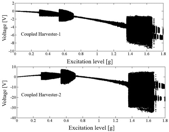 Bifurcation diagram of response voltages versus excitation levels.