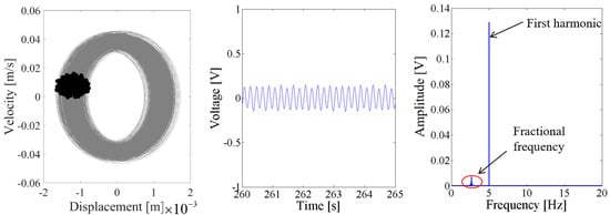 When the excitation level is 0.1 g, Figure 14 and Figure 15 show that the output voltage of the coupled harvester-2 is larger than the coupled harvester-1, and the response voltage of the former is singly periodic. However, the Poincare map in the phase trajectory of the coupled harvester-1 consists of a series of discrete dots, as shown in the first plot of Figure 14. Its time-domain output voltage is the sine curve with fluctuating. The corresponding spectrum in Figure 14 shows that the fundamental harmonic is the uppermost component, while there is a non-ignorable 2.67 Hz fractional frequency component which modulates the fundamental harmonic.