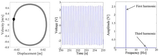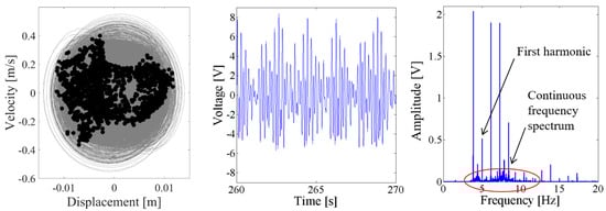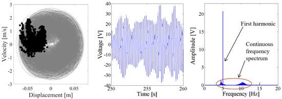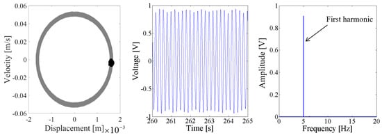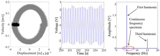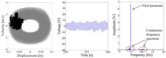 Above results verify the energy harvesting enhancement of the presented NPEHS with two or three energy harvesters. In order to reveal its dynamic mechanism, nonlinear dynamic analysis is provided below. Figure 13 shows the bifurcation diagram of response voltages of the NPEHS-1 under zero initial conditions versus the excitation level. The excitation level ranging from 0 to 1.8 g is the control parameter to numerically simulate the stable response voltage of the NPEHS-1 with the excitation frequency of 5 Hz. It is found from Figure 13 that the NPEHS-1 may undergo periodic and chaotic responses along with the increase of the excitation level, which demonstrates its strong nonlinearity [66,67,71,72,73]. In purpose of checking these nonlinear dynamic response characteristics, the phase plane portrait of the response displacement and the response velocity, and its Poincare map, the time-domain output voltage and its spectrogram via fast Fourier transformation (the excitation frequency is 5 Hz) are shown in Figure 14, Figure 15, Figure 16, Figure 17, Figure 18, Figure 19, Figure 20 and Figure 21. In addition, the Poincare map is drawn by black dots.
