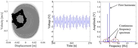 When the excitation level is increased to 1.5 g, the response voltage is modulated by an infinite number of sub-harmonics and super-harmonics, because there are continuous frequency components in the spectrum of Figure 20 and Figure 21. The corresponding Poincare map of phase trajectory consists of a lot of discrete dots. Therefore, the responses of the NPEHS-1 at 1.5 g excitation are chaotic.