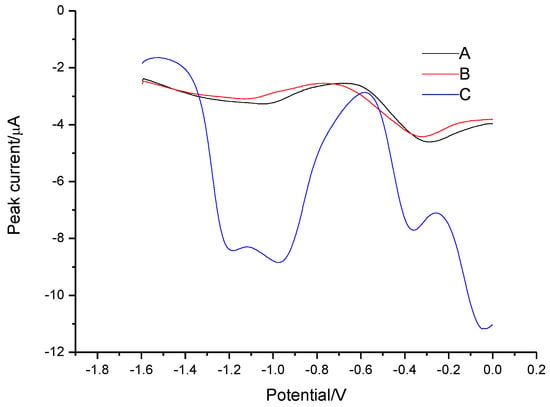The square-wave anodic stripping voltammetry (SW-ASV) on gold disk electrode (GDE) at different condition: (A) [C8mim][PF6]; (B) oxine in [C8mim][PF6]; (C) IL-based liquid phase microextraction (LPME) of 0.4 ng L−1Al(III) in presence of 0.67 mmol L−1 oxine.