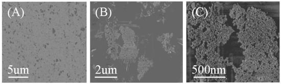 The stripping voltammograms of [C8mim][PF6], oxine in [C8mim][PF6], and the extractant of Al(III)–oxine at gold disk electrode were recorded and shown in Figure 1. Noticeably, there was no appreciable peak in the stripping voltammograms of [C8mim][PF6] (Figure 1A) and oxine in [C8mim][PF6] (Figure 1B); the anode peak at the potential of −1.1 V and −0.8 V emerged for the extractant of 1 ng L−1 Al(III) (C). These peaks should be oxidation peaks of Al deposits and are more positive than normal oxidation peak of Al, which could be due to alloy formation with the Au substrate during deposition. To further verify the hypothesis, the extractant of 10 µg L−1 Al(III) was transferred to the MVC and deposited at −1.8 V for 120 s. The SEM images and XRD analysis of the deposit are shown in Figure 2 and Supplemental Figure S2 (Supplementary Materials).