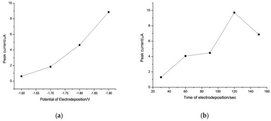 As depicted in Figure 3B, the effect of deposition time on the stripping performance for 1 ng L−1 of Al(III) was investigated in the range from 30 to 180 s. The stripping peak current of Al(III) increased with the increasing of deposition time up to 120 s, and a much wider peak was obtained for longer accumulation time. Hence, an accumulation time of 120 s was selected in the following measurements.