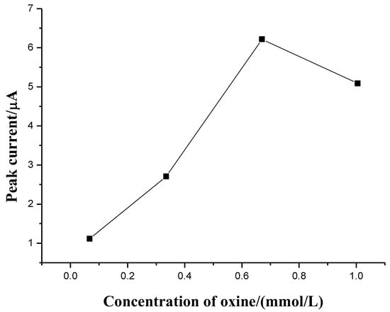 Oxine is a ligand widely used to form chelates with transition and heavy metal cations. The chelates are hydrophobic and can extract into organic solvents/hydrophobic ILs during LPME. The effect of oxine concentration on the current of Al(III) was studied. Figure 4 shows the peak current of aluminum increased with the increasing concentration of oxine up to 0.67 mmol L−1. No further increase was observed for the concentrations above this value, which indicated that 0.67 mmol L−1 of oxine was sufficient for total complexation. The high amount of oxine offers satisfactory Al(III) recovery even in the presence of large excesses of other extractable species. Therefore, 0.67 mmol L−1 of oxine was selected to be an optimized concentration.
