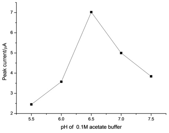 The pH of the aqueous solution plays an important role in a metal–chelate formation and affects the subsequent LPME. In our experiment, the acetate acid buffer, which shows a fairly low level of alumimium contamination [61], was adopted as the supporting electrolytes. Figure 5 shows the effect of pH value of the solution on the signal intensity of Al(III). As can be seen from Figure 5, the peak of current increased as pH increased from 5.5 to 6.5 and started to decrease after pH 7.0. The reduced current in alkaline solution could be due to the formation of aluminum hydroxide, which decreases the amount of free Al3+ ions in sample. Hence, a pH of 6.5 was chosen for LPME.