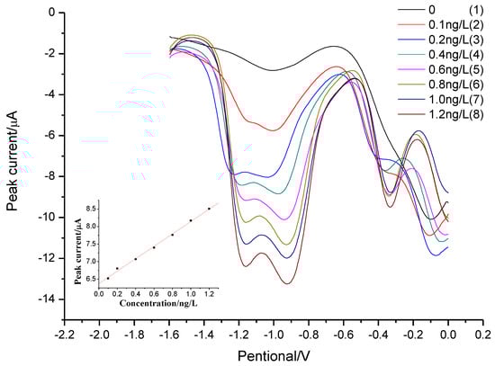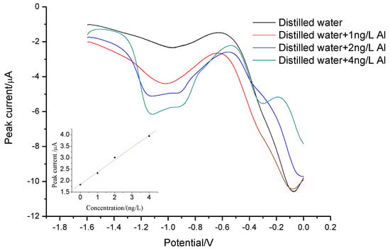 To evaluate the proposed method, the linearity, reproducibility, and limit of detection (LOD) were determined under optimal experimental conditions (Figure 6). Since the presence of ultratrace Al(III) in ultrapure water gave a blank signal, the peak current of individual standard sample was corrected manually by blank subtraction when the linear calibration cure was made. The calibration graph was linear in the range 0.1–1.2 ng L−1 for peak current of Al(III) at −1.1 V. The linear regression equation was ip(Al(III))(µA) = 6.5214 + 1.3977 [Al(III)](ng L−1) (R2 = 0.9978, n = 3). The relative standard deviation (RSD) were 5.4% for ng L−1 Al(III) (n = 8). Since it is difficult to get a water without aluminum (c < 0.1 ng L−1) and no aluminum was found in ethanol, we use the mixture of oxine (dissolved in ethanol) and [C8mim][PF6] as the substitute for blank solutions. A horizontal baseline from the left base of the peak was adopted. The standard deviations of the blank at −1.1 V is 59 nA (N = 25), from which a detection limit of 0.023 ng L−1 (1 pmol L−1) (three times the standard deviations) was obtained. Ten times the standard deviation of the blank was used to evaluate the limits of quantification (LOQ). LOQ obtained was 0.076 ng L−1, which was close to the lower limit of linear range (0.1 ng L−1) of our method. These results proved we were not over-valuating the sensitivity of the method by using ethanol to simulate water without Al(III) and the LOD obtained is reasonable. To the best of our knowledge, it provided the lowest DL for aluminum detection (Table 1).