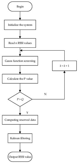 In the above formula, represents the state estimate of RSSI at time k; represents the next predicted value of RSSI at time K; represents the prediction of the k + 1 time; denotes the predictive matrix; denotes the variance matrix of the prediction error estimate for the moment at k time. represents a variance matrix; represents a gain matrix. The Gaussian-Kalman filter algorithm flowchart is shown in Figure 1.