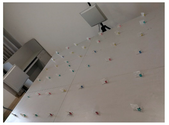 The communication frequency between the reader and labels is between 920 MHz and 926 MHz. The feeder line is used to connect the reader and the antenna and plays the role of the data transmitter. The reader is connected to the router through WiFi. Users can operate through the computer, and the database server is installed on a personal computer. The labels are placed as shown in Figure 3 with a distance of approximately 60 cm between each adjacent reference label in each row. Figure 4 is the whole placement scenario of the device.