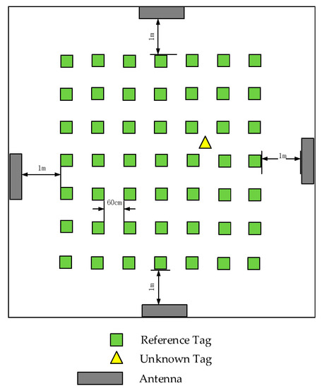 One of the most famous RFID positioning algorithms is LANDMARC [17]. The LANDMARC system is a typical reference-tag-based RFID positioning method proposed by a research group of the Hong Kong University of Science and Technology. By introducing a reference label to assist positioning, a reference label matrix is arranged in the positioning space; RSSI values of the unknown label and the reference label are measured; and the nearest neighbor K value algorithm is used for positioning. However, the number of reference tags is huge. The introduction of a large number of these reference labels will also require many unnecessary calculations, as well as reduce the positioning accuracy.