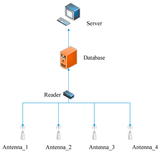 Figure 5 is a block diagram of the RFID information acquisition module. The monitored area is an area composed of four antennas of the same specification, and a number of the reference labels and target labels are deployed inside the area. When starting to collect RFID information, the user can control the reader through the database server, and the reader sends an instruction to the antenna to transmit the electromagnetic wave to the monitoring area. After the tag receives the electromagnetic wave, the tag transmits its own information (including RFID antenna coding, RFID tag ID number, RSSI value, phase value, etc.) fed back to the reader through the antenna to be stored in the database to complete the data acquisition. The server reads the real-time electromagnetic information (mainly the signal strength value) from the database and completes the positioning of the unknown label through several specific algorithms in this experiment.