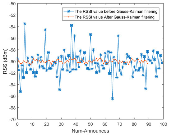 - Kalman filtering is used to perform the Gaussian fit-filtering of the RSSI value, and the average value of filtered RSSI is selected as the input of the positioning algorithm to calculate the positioning result.